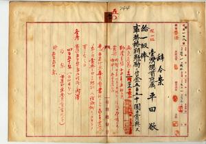 五〇 地方部長楠正秋ノ内申ニヨリ病気危篤ニ陥リタル台湾総督府属平田敬ニ一級俸ヲ給シ事務格別勉励ニ付キ一時金ヲ賞与ス(秘甲第一二八号)