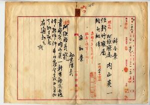 六〇 阿緱庁長佐藤謙太郎ト新竹庁長家永泰吉郎ノ内申ニヨリ阿緱庁属内山英一ヲ新竹庁属ニ任ス(秘甲第五九号)〔尚、所蔵番号282と283の文書は誤綴にて元文書では289の後に綴じられていたものと思われる〕