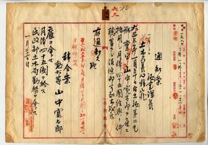 六三 土木局長心得高橋辰次郎ノ内申ニヨリ元満洲日日新報社記者並ニ元台湾日日新報社編輯員ニシテ臨時台湾総督府工事部雇山中寛太郎ヲ土木史編纂事務ニ従事セシムル為メ工事部雇ヲ命シ月俸四五円ヲ給シ民政部土木局勤務ヲ命ス(秘甲第一六八号)