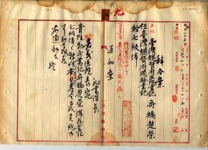 九 基隆港務署長井村大吉ノ内申ニヨリ台湾総督府医院書記舟橋楚栄ヲ台湾総督府港務書記ニ任シ七級俸ヲ給ス(秘甲第一七五号)