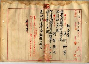 一七 通信局長角源泉ノ内申ニヨリ台北郵便局臨時在勤台湾総督府雇岩淵和男ヲ台湾総督府通信属ニ任シ月俸ヲ給シ台南郵便局通信工手河原勝次ヲ台湾総督府通信技手ニ任シ月俸ヲ給シ民政部通信局勤務ヲ命ス(秘甲第一八九号)