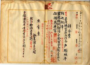 三二 麻刺里亜ニ罹リ職ニ堪ヘサルヲ以テ辞職ヲ願出タル彰化郵便局勤務台湾総督府通信属戸塚林平ニ七級俸ヲ給シ事務格別勉励ニ付キ一時金ヲ賞与シ本官ヲ免ス(秘甲第二二〇号)