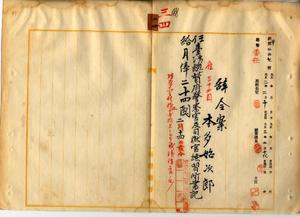 三四 警察官及司獄官練習所長代理賀来倉太ノ内申ニヨリ警察官及司獄官練習所雇本多始次郎ヲ警察官及司獄官練習所書記ニ任シ月俸二四円ヲ給ス(秘甲第二二七号)