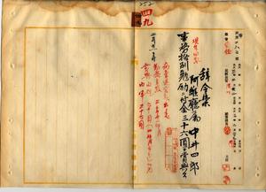 四九 阿緱庁佐藤謙太郎ノ内申ニヨリ疾病ニ罹リ職ニ堪ヘサルヲ以テ辞職ヲ願出タル阿緱庁属中井四郎ニ事務格別勉励ニ付キ一時金ヲ賞与ス(秘甲第二八〇号)
