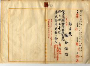 七 台北医院長稲垣長次郎ノ内申ニヨリ台北医院雇細谷信治ヲ台湾総督府医院書記ニ任シ月俸三〇円ヲ給シ台北医院勤務ヲ命ス(秘甲第三一〇号)