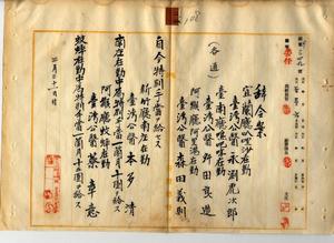 二二 民政部警察本署長代理中山佐之助ノ内申ニヨリ宜蘭庁叭哩沙在勤台湾公医永渕虎次郎・台南庁噍吧哖在勤台湾公医舛田良蔵・阿緱庁阿里港在勤台湾公医森田義則ニ自今特別手当ヲ給セス、新竹庁南庄在勤台湾公医本多清ニ南庄在勤中特別手当トシテ一箇月一〇円ヲ給シ、阿緱庁蚊蟀在勤台湾公医蔡章意ニ蚊蟀在勤中特別手当トシテ一箇月一五円ヲ給ス(秘甲第三四九号)