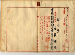 二六 財務局長中川友次郎ノ内申ニヨリ退職ヲ願出タル雇黄連添ニ事務格別勉励ニ付キ一時金ヲ賞与ス(秘甲第三六三号)