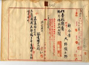 五四 台北庁長井村大吉ノ内申ニヨリ元嘉義庁属木大野儀三郎ヲ台北庁属ニ任シ月俸三五円ヲ給ス(秘甲第四三三号)