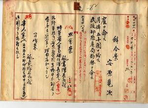 五九 殖産局長高田元治郎ノ具申ニヨリ元陸軍技手安原亀次ニ雇ヲ命シ月俸五〇円ヲ給シ民政部殖産局勤務ヲ命ス(秘甲第四四八号)