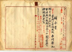七六 マラリヤニ罹リ職ニ堪ヘサルヲ以テ辞職ヲ願出タル台湾公学校教諭吉川栄三ニ月俸三七円ヲ給シ事務格別勉励ニ付キ一時金ヲ賞与シ本官ヲ免ス(秘甲第四八九号)[七五も見よ]