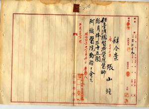 一一三 阿緱長芳沢鷹之助ノ内申ニヨリ阿緱雇張山鐘ヲ台湾総督府医院医師ニ任シ阿緱勤務ヲ命ス