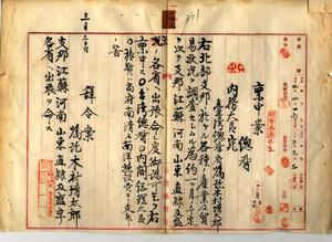 一二三 殖産局長高田元治郎ノ内申ニヨリ目下南支那ノ貿易調査ノ為上海ニ駐在セル台湾総督府嘱託木村増太郎ヘ北部支那ニ於ケル各種ノ産業及貿易状況ヲ調査セシムル為、江蘇省河西省山東県直隷及盛京省ヘ出張ヲ命ス