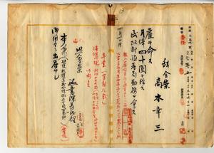 二 殖産局長高田元治郎ノ具申ニヨリ輸入杉苗事務ニ従事セシムル為メ高本幸三ニ雇ヲ命シ民政部殖産局勤務ヲ命ス(秘甲第三三四号)