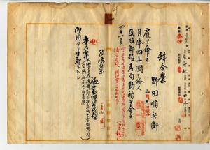四 殖産局長高田元治郎ノ具申ニヨリ輸入蔴苗検査事務ノ為野田順兵衛ニ雇ヲ命シ民政部殖産局勤務ヲ命ス(秘甲第三五三号)
