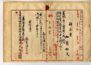五 民政部蕃務本署長事務取扱代理警視加福豊次ノ内申ニヨリ太魯閣蕃討伐隊傷病者救護ノ為メ元台南医院医務嘱託加藤好文ニ蕃地ニ於ケル医務ヲ嘱託シ手当一箇月九五円ヲ給シ民政部蕃務本署勤務ヲ命ス(秘甲第三六四号)