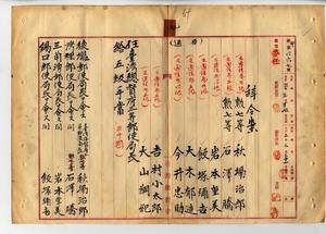 九 台湾総督府通信局長角源泉ノ内申ニヨリ来ル四月一日ヨリ新設ノ台湾総督府三等郵便局ノ為メ元通信属ノ秋場治郎・石沢騰・岩本重美・飯塚弥吉・大木郁造・今井忠助・吉村小太郎・大山綱紀ヲ台湾総督府三等郵便局長ニ任シ五級手当ヲ給シ、台湾総督府三等郵便局長秋場治郎ニ後壠郵便局長ヲ命シ、台湾総督府三等郵便局長石沢騰ニ湾裡郵便局長ヲ命シ、台湾総督府三等郵便局長岩本重美ニ三角湧郵便局長ヲ命シ、台湾総督府三等郵便局長飯塚弥吉ニ錫口郵便局長ヲ命シ、台湾総督府三等郵便局長大木郁造ニ布袋嘴郵便局長ヲ命シ、台湾総督府三等郵便局長今井忠助ニ北門郵便局長ヲ命シ、台湾総督府三等郵便局長吉村小太郎ニ他里霧郵便局長ヲ命シ、台湾総督府三等郵便局長大山綱紀ニ楠梓坑郵便局長ヲ命ス(秘甲第四六七号)