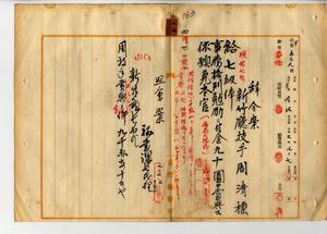 二三 疾病ニ罹リ職ニ堪ヘサルヲ以テ辞職ヲ願出タル新竹庁技手周清標ニ七級俸ヲ給シ事務格別勉励ニ付キ一時金ヲ賞与シ本官ヲ免ス(秘甲第五三九号)