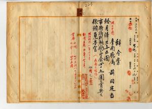 三六 疾病ニ罹リ職ニ堪ヘサルヲ以テ辞職ヲ願出タル台南庁属前田完吉ニ月俸三五円ヲ給シ事務格別勉励ニ付キ一時金ヲ賞与シ本官ヲ免ス(秘甲第五六六号)