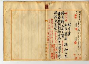 五一 疾病ニ罹リ職ニ堪ヘサルヲ以テ辞職ヲ願出タル台中庁属塩谷三郎ニ月俸三三円ヲ給シ事務格別勉励ニ付キ一時金ヲ賞与シ本官ヲ免ス(秘甲第五九四号)