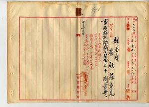 二八 台湾総督府殖産局長高田元治郎ノ具申ニヨリ殖産局雇秋篠章見ヲ御用済ニ付キ解雇シ事務格別勉励ニ付キ一時金ヲ賞与スルノ件(秘甲第七九六号)