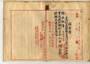 三七 南投公学校勤務台湾公学校教諭兼台湾公学校校長今井錠太郎ハ脚気ニ罹リ職務ニ堪ヘ難キ旨ヲ以テ辞職願ニヨリ三級俸ヲ給シ本官並兼官ヲ免シ事務格別勉励ニ付キ一時金ヲ賞与スルノ件(秘甲第八一六号)