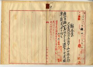 四 元台湾総督府通信手山口麻太郎ニ退官一時金ヲ給ス(秘甲第八〇一号)台湾総督府通信局長角源泉ノ内申ニヨリ脚気ニ罹リ職ニ堪ヘサルヲ以テ辞職ヲ願出タル台湾総督府属山口秀三郎ト疾病ニ罹リ職ニ堪ヘサルヲ以テ辞職ヲ願出タル台湾総督府通信手山口麻太郎ニ事務格別勉励ニ付キ一時金ヲ賞与シ本官ヲ免シ(五月七日付)、元台湾総督府属山口秀三郎ニ退官一時金ヲ給ス(五月八日付)(秘甲第八〇一号)(52~57誤綴、五を見よ)