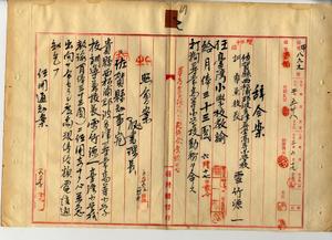 七 台南庁長松木茂俊ノ内申ニヨリ佐賀県西松浦郡波多津尋常高等小学校訓導兼校長雪竹源一ヲ台湾小学校教諭ニ任シ打狗尋常高等小学校勤務ヲ命ス(秘甲第八九九号)
