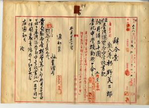 一〇 台北中学校長土屋員安ノ稟申ニヨリ台湾総督府雇杉野美三郎ヲ台湾総督府中学校書記ニ任シ台北中学校勤務ヲ命ス(秘甲第九三八号)