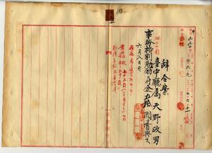 三五 台中庁長枝徳二ノ内申ニヨリ疾病ニ罹リ職ニ堪ヘサルヲ以テ退官ヲ願出タル台中庁属天野政男ニ事務格別勉励ニ付キ一時金ヲ賞与ス(秘甲第九九二号)
