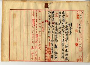 三六 土木局長心得高橋辰次郎ノ内申ニヨリ経費整理上ノ都合ニヨリ病気其他ノ事故ヲ以テ辞職ヲ願出サセタル職員ニ付キ、元台湾総督府技手岡本源蔵ニ退官一時金ヲ給シ(六月一六日付)、元台湾総督府技手森鉦太郎ニモ退官一時金ヲ給シ(六月一六日付)、台湾総督府技手岡本源蔵ト同森鉦太郎ヲ昇級シ、台湾総督府技手岡本源蔵(慢性腸加答児)・同高崎斉蔵(麻拉里亜)・同石村嘉太郎(脚気)・同森鉦太郎(麻拉里亜)ヲ事務格別勉励ニ付一時金ヲ賞与シ依願本官ヲ免シ、雇渡部祐信・同富永求吾ヲ昇級シ、雇土岐賎夫(家事上ノ都合)・同渡部祐信・同富永求吾(病気)ニ事務格別勉励ニ付キ一時金ヲ賞与シ雇ヲ免ス(六月一〇日付)(秘甲第九九三号)