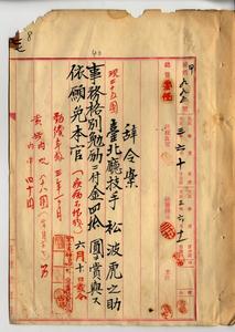 三七 疾病ニ罹リ職ニ堪ヘサルヲ以テ辞職願出タル台北庁技手松波虎之助ニ事務格別勉励ニ付キ一時金ヲ賞与シ本官ヲ免ス(秘甲第九九五号)
