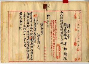 四三 民政部蕃務本署長事務取扱警視総長亀山理平太ノ内申ニヨリ花蓮港庁属平松博雄ニ分任臨時現金前渡官吏ヲ命ス(秘甲第一〇〇八号)