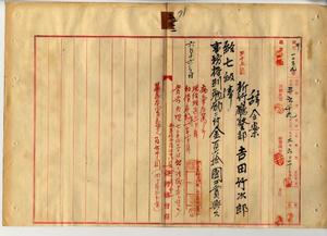 五二 新竹庁長ノ電報内申ニヨリ脚気ニ罹リ内地ニ転地療養中ノ処危篤ニ欠リタル新竹庁警部吉田竹太郎ニ七級俸ヲ給シ事務格別勉励ニ付キ一時金ヲ賞与ス(秘甲第一〇三九号)