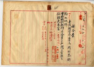 六 麻拉里亜ニ罹リ職ニ堪ヘサルヲ以テ辞職願出タル台湾総督府通信属内田恭助ヲ昇給ノ上事務格別勉励ニ付キ一時金ヲ賞与シ本官ヲ免ス(秘甲第一〇九五号)