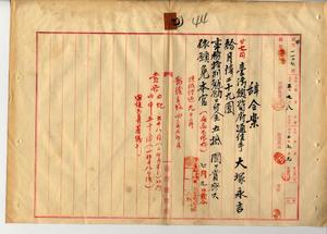 九 疾病ニ罹リ職ニ堪ヘサルヲ以テ辞職願出タル台湾総督府通信手大塚永吉ニ月俸二九円ヲ給シ事務格別勉励ニ付キ一時金ヲ賞与シ本官ヲ免ス(秘甲第一一〇七号)