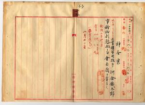 一五 台湾総督府工業講習所長矢口玉五郎ノ内申ニヨリ病気危篤に陥リタル台湾総督府工業講習所技手河合鉄太郎ニ事務格別勉励ニ付キ一時金ヲ賞与ス(秘甲第一二二三号)