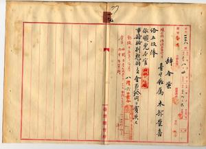 一九 疾病ニ罹リ職ニ堪ヘサルヲ以テ辞職ヲ願出タル台中庁属木部豊喜ニ五級俸ヲ給シ本官ヲ免シ事務格別勉励ニ付キ一時金ヲ賞与ス(秘甲第一二二八号)