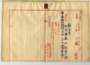 二五 桃園庁長武藤針五郎ノ内申ニヨリ病気ノ為メ退官ノ桃園庁属只熊善五郎ニ事務格別勉励ニ付キ一時金ヲ賞与スルノ件(秘甲第一三七六号)