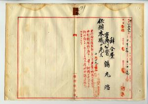 三五 台北庁長加福豊次ノ内申ニヨリ辞職願出ノ頂双渓在勤台湾公医鶴丸治ヲ免職ノ件(秘甲第一五五二号)