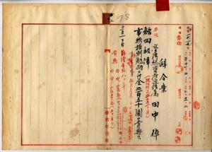 二 台湾総督府通信局長角源泉ノ内申ニヨリ台湾総督府通信属田中倬ハ病気危篤ニ付キ四級俸ニ昇級ノ上事務格別勉励ニ付キ一時金ヲ賞与スルノ件(秘甲第一六一九号)