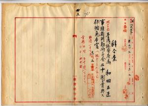 五 台湾総督府殖産局長高田元治郎ヨリ具申ノ台湾総督府属和田正臣ハ志願兵トシテ入営ノ為メ辞職願ニヨリ事務格別勉励ニ付キ一時金ヲ賞与スルノ件(秘甲第一六二三号)