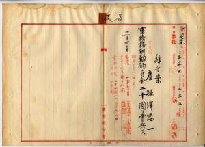 七 台湾総督府土木局長心得高橋辰次郎ヨリ内申ノ土木局雇堀沢忠一ハ徴兵ニ付キ入営ノ為メ辞職願ニヨリ事務格別勉励ニ付キ一時金ヲ賞与スルノ件(秘甲第一六二九号)