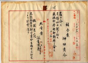 四五 台湾総督府学務部長隈本繁吉ノ内申ニヨリ元税関監吏神田貢介ヲ雇ニ採用シ月俸四〇円ヲ給シ民政部学務部勤務ヲ命スルノ件(秘甲第一七三八号)