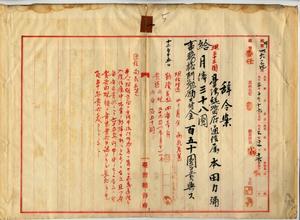 一 台湾総督府通信局長角源泉ノ内申ニヨリ阿緱庁出張中流行性感冒ニ罹リ危篤ノ台湾総督府通信属本田力弥ニ月俸三八円ニ昇給ノ上事務格別勉励ニ付キ一時金ヲ賞与スルノ件(秘甲第一六三四号)