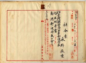 一七 台湾総督府通信局長角源泉ノ内申ニヨリ阿緱郵便局勤務台湾総督府通信属永野辰重ニ台湾総督府三等郵便局長ニ任シ五級手当ヲ給シ新港郵便局長ヲ命スルノ件(秘甲第一七九三号)