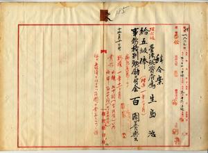 二八 台湾総督府殖産局長高田元治郞ノ内申ニヨリ病気危篤ノ台湾総督府属生島治ニ五級俸ニ昇級ノ上事務格別勉励ニ付キ一時金ヲ賞与スルノ件(秘甲第一八二三号)