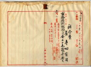 四四 台湾総督府学務部長隈本繁吉ノ内申ニヨリ病気ノ為メ退職願出ノ雇寺田富司ニ事務格別勉励ニ付キ一時金ヲ賞与スルノ件(秘甲第一七六五号)