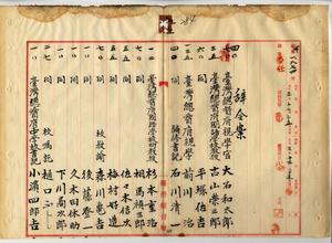 五三 台湾総督学務部長隈本繁吉ノ内申ニヨリ台湾総督府視学官大石和太郎、台湾総督府国語学校教授ノ古山栄三郎・平塚佐吉、台湾総督府視学前川治、台湾総督府編修書記石川清一、台湾総督府国語学校助教授ノ杉本重治・相馬禎三郎・佐々木信次・梅村好造、台湾総督府国語学校教諭ノ森川亀吉・後藤登一・久木田休助・下川高次郎、台湾総督府国語学校嘱託樋口ふじ、台湾総督府中学校書記小浜四郎吉、台湾総督府高等女学校書記牟田口保次郎、台湾公学校教諭ノ江口保・坂根十二郎、台湾小学校教諭広松良臣、澎湖庁属高田義五郎、台東庁属磯貝武平ニ台湾小学校及台湾公学校教員講習勤労金ヲ給与ノ件(秘甲第一八七四号)