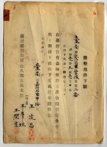 一 台南庁管内開墾地払下ニ関スル台南庁長治一図里営後庄仮二番ノ官有原野ニ対スル台南庁嘉祥外里中路庄王達昌・王開宗外ノ開墾地払下願書一括綴(民殖第五三〇八号)