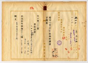 〔元台南監獄看守〕故千葉末吉寡婦千葉よ志の扶助料證書下賜